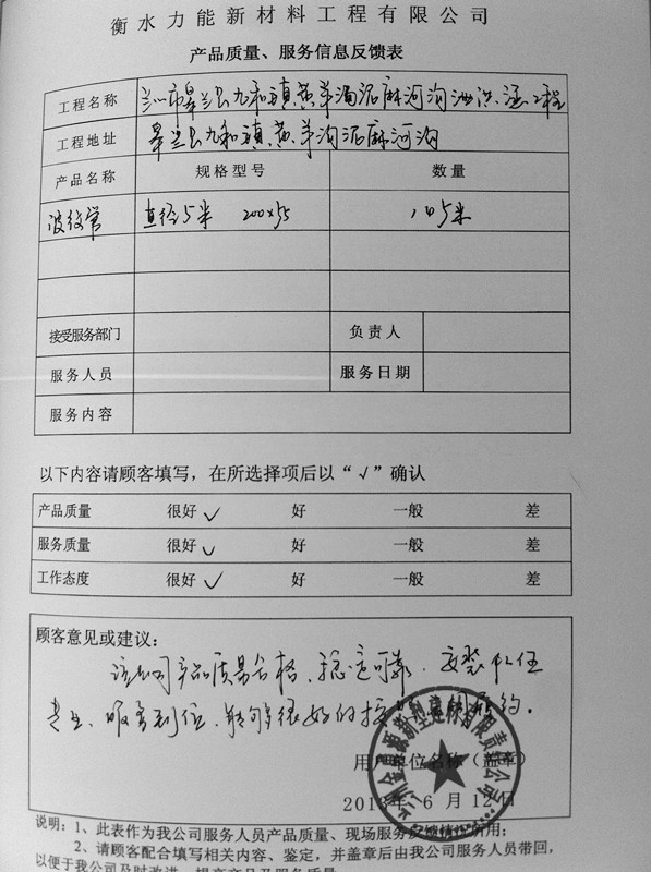 蘭州市對衡水力能波紋涵管產(chǎn)品質(zhì)量和服務(wù)信息的反饋意見或建議: