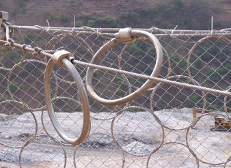 被動環(huán)形邊坡柔性防護網(wǎng)是由鋼絲繩網(wǎng)、環(huán)形網(wǎng)、(需攔截小塊落石時附加一層鐵絲格柵)、固定系統(tǒng)(錨桿、拉錨繩、基座和支撐繩)減壓環(huán)和鋼柱四個主要部分構(gòu)成。鋼柱和鋼絲繩網(wǎng)連接組合構(gòu)成一個整體,對所防護的區(qū)域形成面防護,從而阻止崩塌巖石土體的下墜,起到邊坡防護作用。