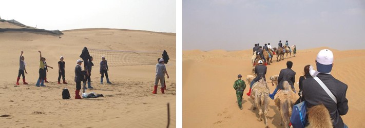大家懷著激情昂揚的心情下了車,進(jìn)行了沙漠排球、滑沙、騎駱駝等各種項目