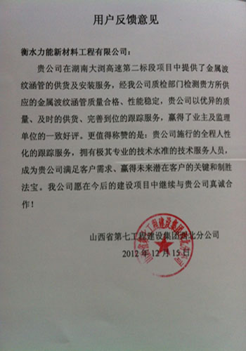 貴公司在湖南大瀏高速第二標(biāo)段項(xiàng)目中提供了金屬波紋涵管的供貨及安裝服務(wù),經(jīng)我公司質(zhì)檢部門檢測(cè)貴方所供應(yīng)的金屬波紋涵管質(zhì)量合格,性能穩(wěn)定,貴公司以優(yōu)異的質(zhì)量,及時(shí)的供貨,完善到位的跟蹤服務(wù),贏得了業(yè)主及監(jiān)理單位的一致好評(píng)。更值得稱贊的是:貴公司施行的全程人性化的跟蹤服務(wù),擁有極其專業(yè)的技術(shù)水準(zhǔn)的技術(shù)服務(wù)人員,成為貴公司滿足客戶需求,贏得未來潛在客戶的關(guān)鍵和制勝法寶。我公司愿在今后的建設(shè)項(xiàng)目中繼續(xù)與貴公司真誠合作!
